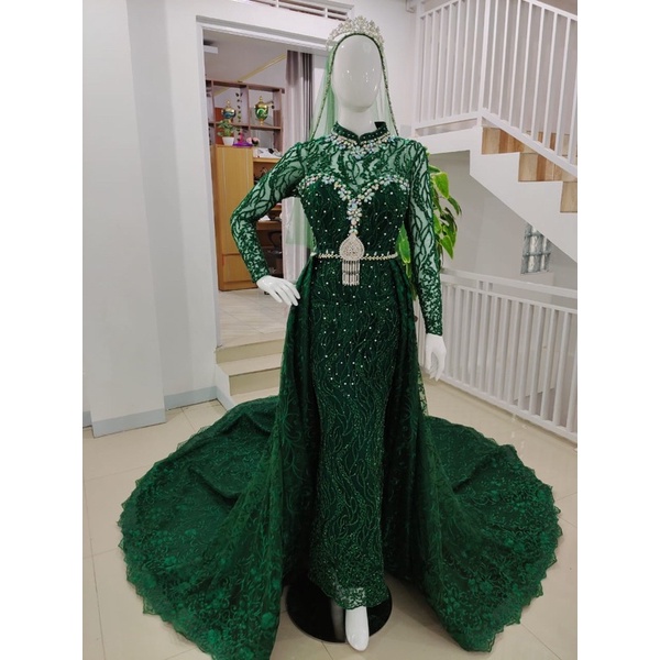 Baju gaun pengantin premium warna hijau wedding dress gown mekar full payet.